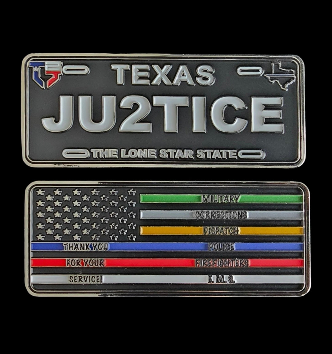 Below you will see different items made for our customers. These items are not available for purchase. Texas Ju2tice has obtained our customers permission to display their items on our page. Email us to get a custom coin designed for your company or department.